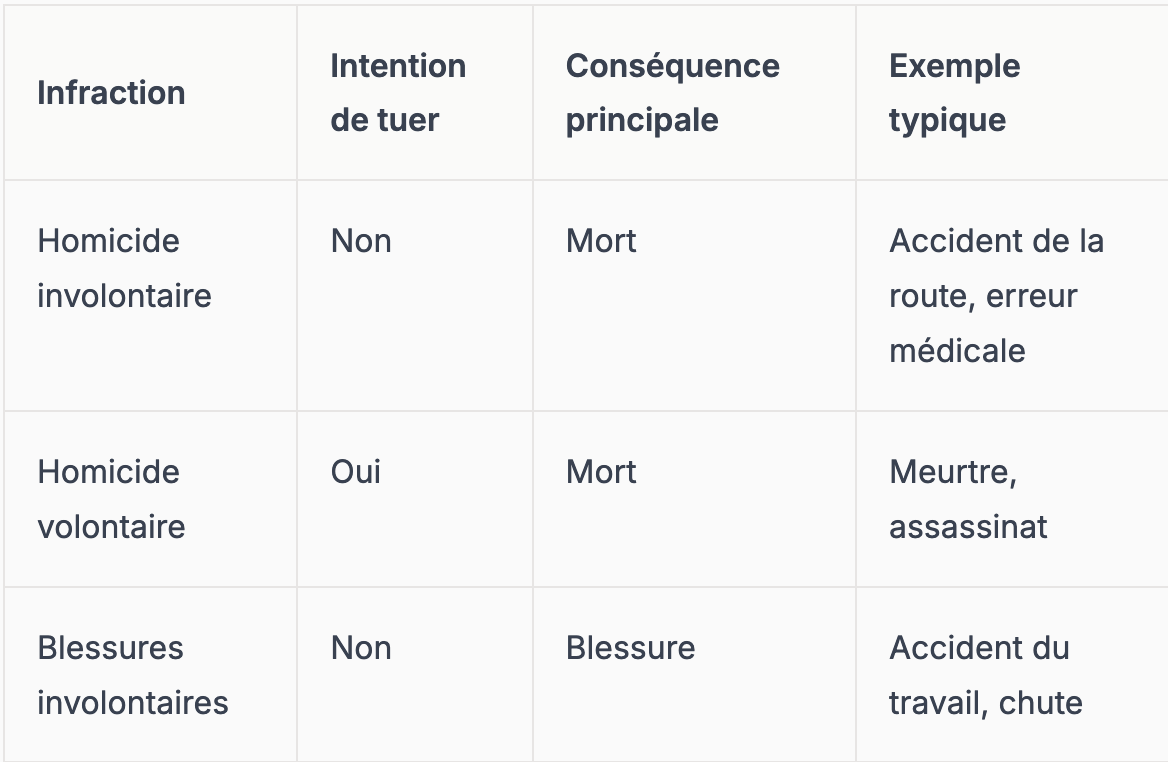 La différence entre l’homicide volontaire et l’homicide involontaire tient à l’intention : dans le premier cas, la mort est voulue, dans le second, elle résulte d’une faute sans volonté de tuer.