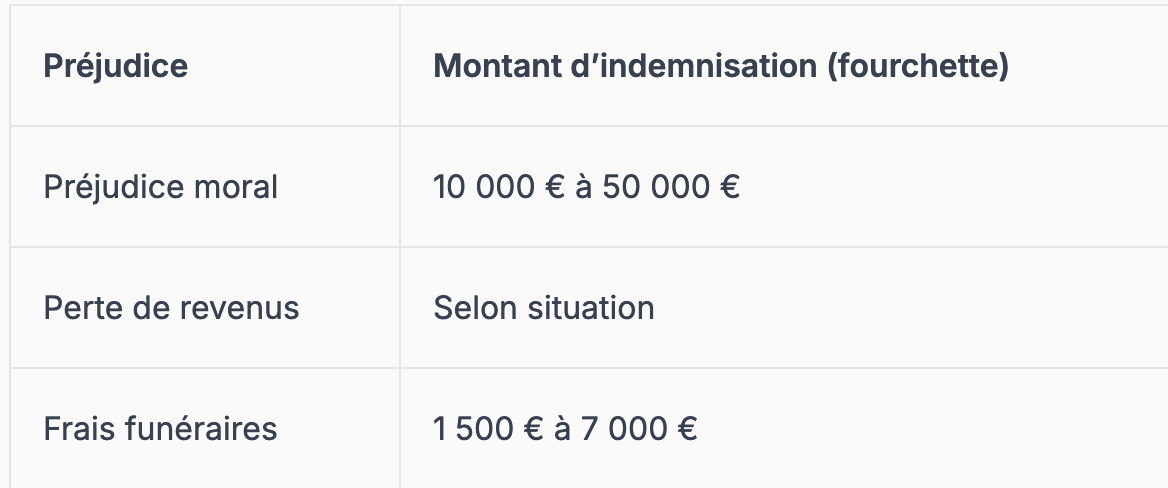 Le montant de l’indemnisation dépend de nombreux critères : nature du lien avec la victime, perte de revenus, souffrance morale, frais funéraires et conséquences sur la vie quotidienne. Les juges s’appuient sur des barèmes et des expertises pour fixer le montant dû. À titre d’exemple, la perte d’un conjoint peut donner lieu à une indemnisation de plusieurs dizaines de milliers d’euros, tandis que la perte d’un parent ou d’un enfant, selon les circonstances de l’homicide involontaire, peut entraîner des montants adaptés à la gravité du préjudice.
