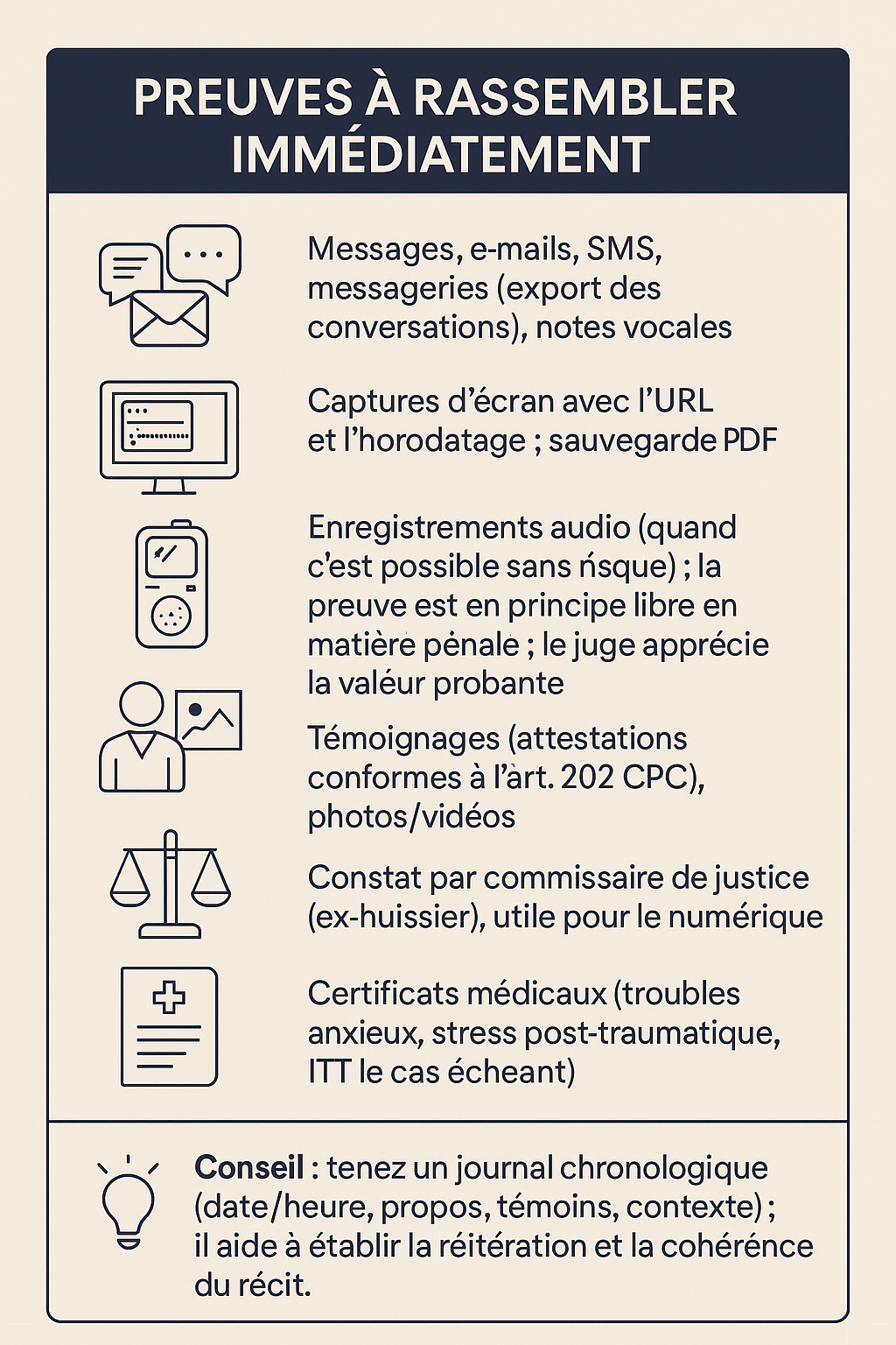 Conseil : tenez un journal chronologique (date/heure, propos, témoins, contexte) ; il aide à établir la réitération et la cohérence du récit.