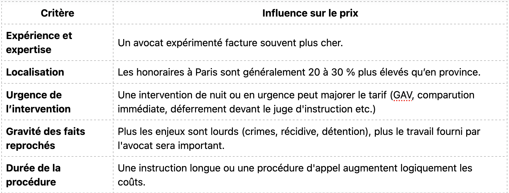 Les tarifs d’un avocat en droit pénal dépendent de plusieurs facteurs :